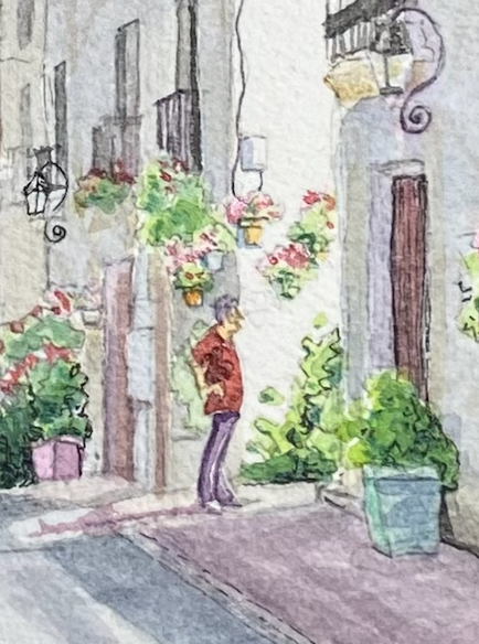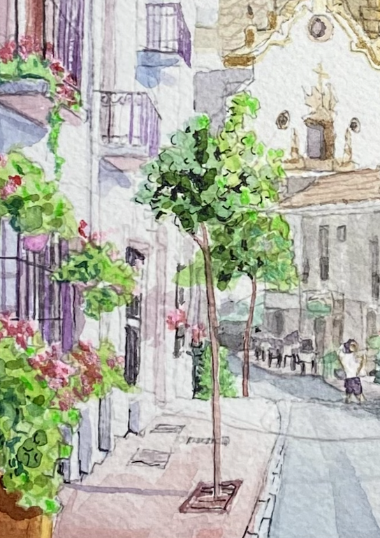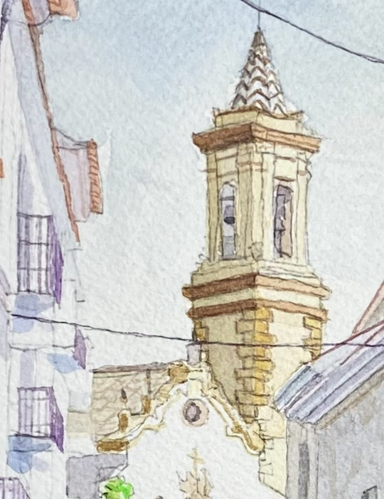 This watercolor painting was created on a sunny day, during siesta, in the town of Estepona that sits on Mediterranean coast of Spain. Looking east, The church in the background Iglesia de Santa Maria de los Remedios, or the Church of Saint Mary of the remedies. The Painting was started at mid-day and reflects the bright Mediterranean sunlight off the white walls of the buildings. Colors of the vegetation and flowers stand out from the white and beige walls of the city. I was impressed with how the sky and cityscape nearly blended in the light of the afternoon. It gives the painting an airy clean feel atmosphere and captures the relaxed feel of this costal city.