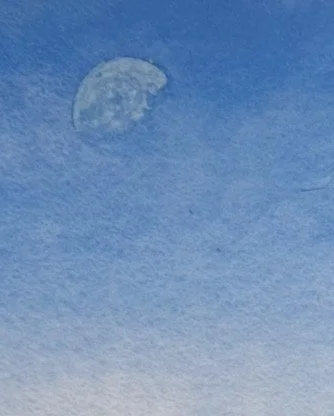 The scene is dominated by expansive warm blues reflected from the sand and sky, evoking the sensory experience of heat, salt air, and bright coastal vistas. These cool tones contrast with the warm yellow-orange hull and the buoys that drift rhythmically with the current. In the distance, the Pacific opens the composition outward, with the quiet presence of the moon reinforcing the sense of space and calm.