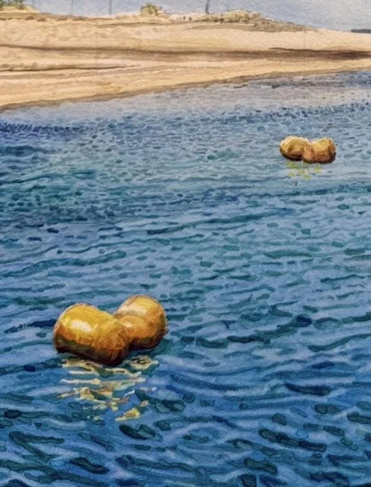 The composition is shaped by expansive, luminous blues drawn from sand and sky, evoking the sensory experience of heat, salt air, and bright coastal light. These cooler tones contrast with the warm yellow-orange hull and the buoys drifting rhythmically with the current. In the distance, the Pacific opens the scene, while the subtle presence of the moon reinforces a sense of space and quiet calm.