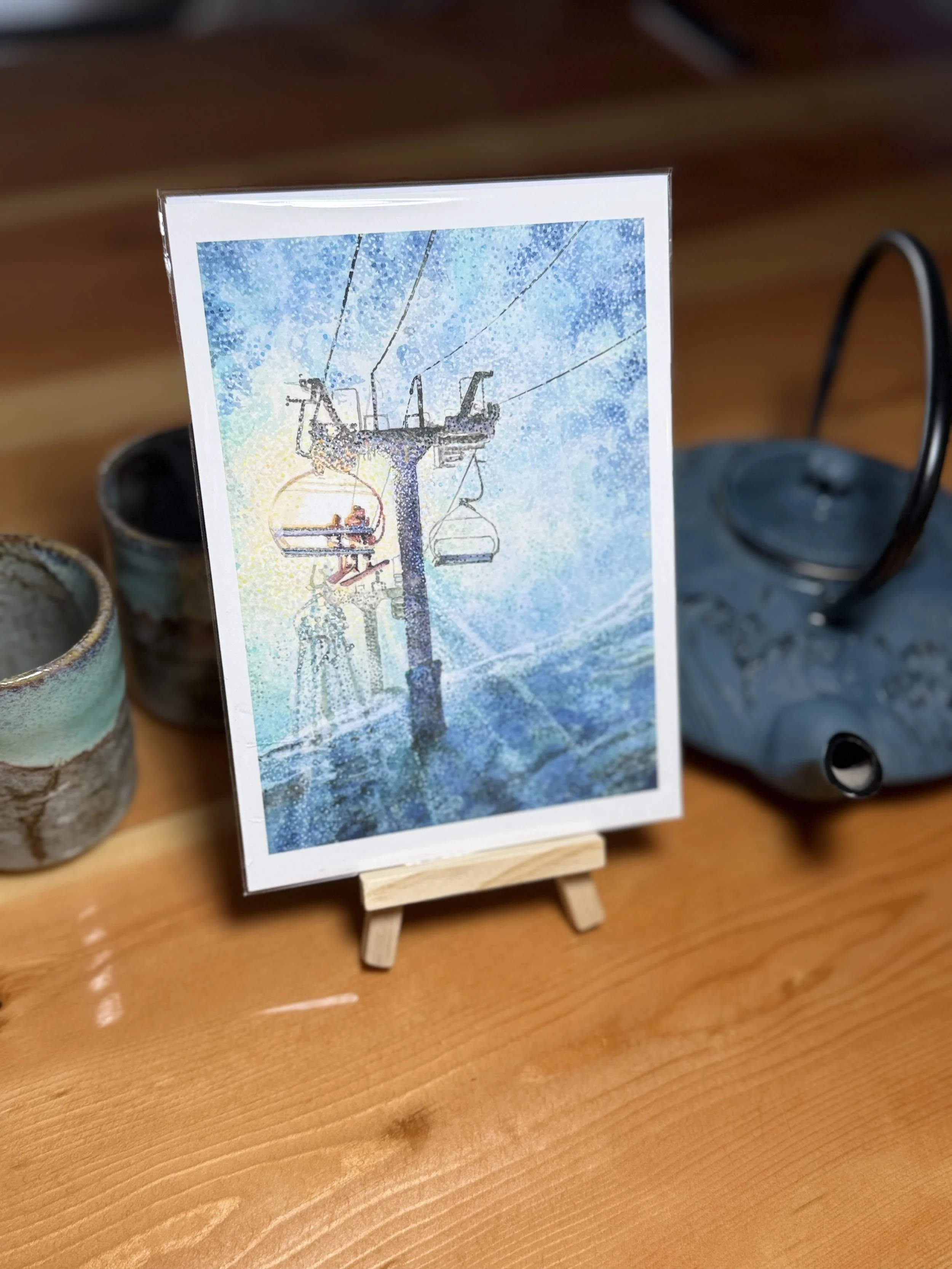 This print depicts two snowboarders silhouetted against the rising sun, their forms contrasted by a ski lift tower in the foreground that guides the viewer’s eye toward the subject. A cool, subdued color palette emphasizes the cold atmosphere, while soft, diffused hues evoke the way light is filtered through falling snow. This same effect creates a sense of depth, as distant forms dissolve into the hazy, light-filled air.